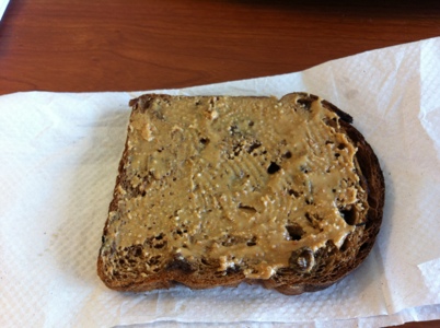 My breakfast this morning was a piece of cinnamon raisin toast and a small spoonful of Teddie. It really hit the spot! I also had a mini Luna bar on my drive in to work today along with a stellar travel mug of coffee.