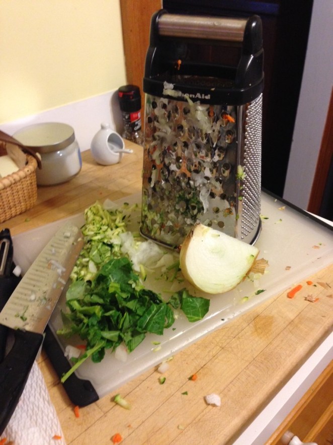 There are many things I love about this recipe. You can make it with many different types of vegetables – basically you can use anything that you have on hand. The preparation of the vegetables is so easy and quick – who doesn’t love getting their grater out after a long day!? I had fun grating the vegetables – and even rough chopping my kale. I did all of these steps while I was waiting for the stock to come to a boil. Another wonderful thing about this recipe is that it comes together so quickly once you have everything on the stove. It is also such a cost effective recipe. The most expensive thing I bought for the recipe was the Gruyere cheese which was $7.50 – the rest of the ingredients came to maybe 6 dollars. Not bad for such a delicious meal – and I will be able to use a lot of the left over ingredients in other meals this week. One note – if you garnish this soup with parsley, it brings it to a whole other level. I highly recommend it! I served this soup with a glass of red wine and a chunk of hearty sour dough bread. A perfect meal, if you ask me.