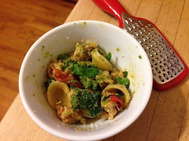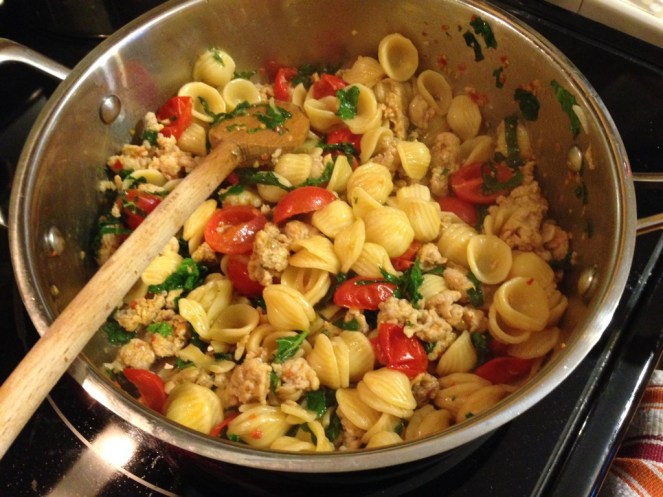 A new dinner came together in my head – orecchiette with chicken sausage, grape tomatoes, kale and pesto.