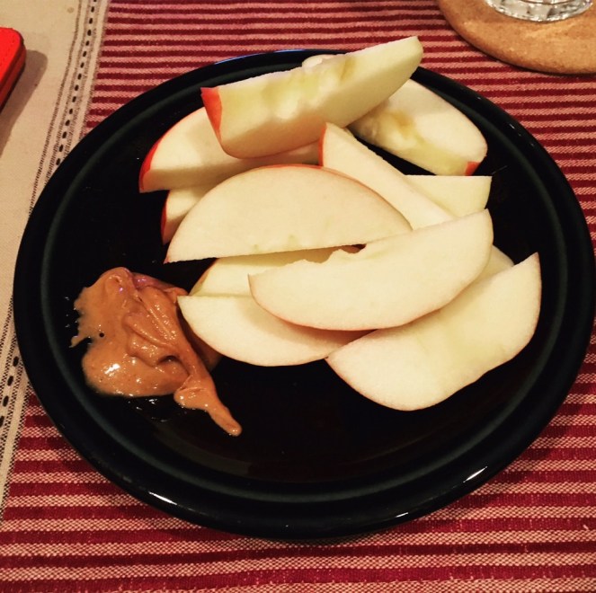 Saturday night we watched another movie. We each relaxed with a glass of Malbec and I made myself another healthy snack – a classing, apple and peanut butter! It did the trick and filled me up, and for that I was very thankful.