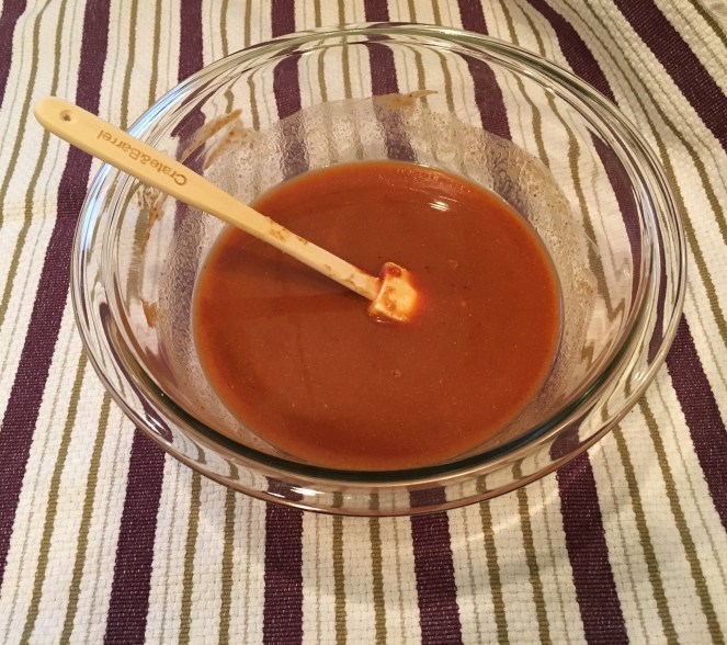 On Sunday afternoon I got our ingredients together. I mixed the BBQ sauce with some hot sauce, apple cider vinegar and water: