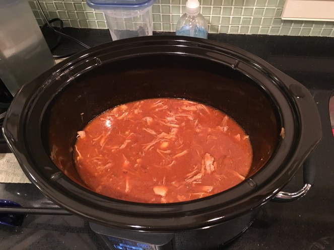 We put the pork shoulder in the crock pot, poured our sauce in and turned on the crock pot – the pork cooked on high for five hours. Let me pause and tell you how much I love the crock pot. While the pork was cooking I got on the treadmill for almost an hour (50 minutes to be exact). I should have done more (I went through the entire weekend without doing a single load of laundry – I also have a few unread New Yorkers. I really need to catch up!) but I was satisfied with the exercise.