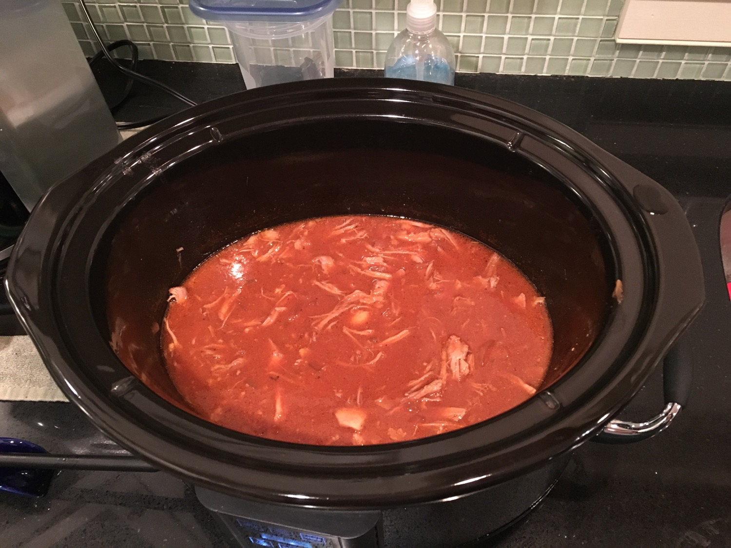 The pork was cooking and our kitchen smelled great. With an hour left SC used a spoon and broke up the shoulder so it was submerged into our sauce. (I had added more bbq sauce, vinegar and water about three hours into the cooking process):
