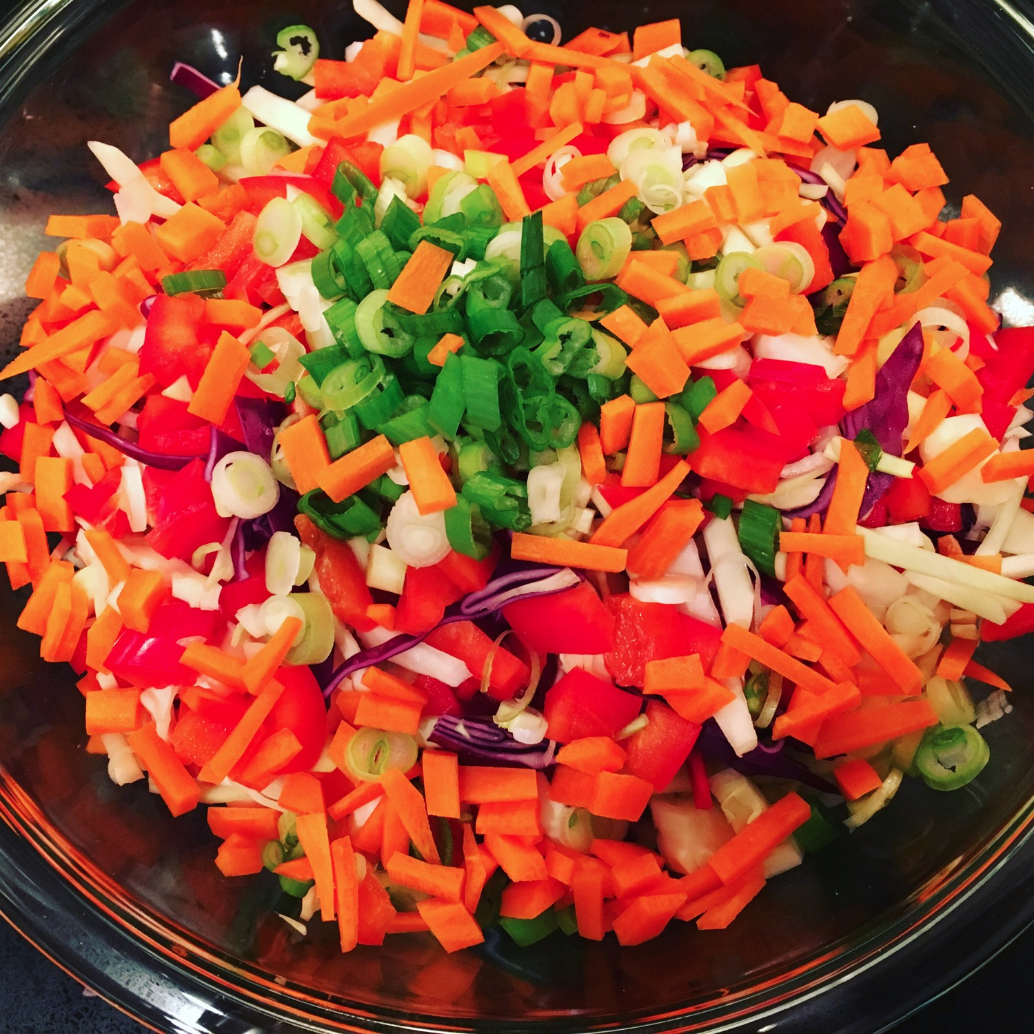 For the other vegetables, I used a red pepper, a big carrot and a few scallions. For a dressing I used garlic powder, salt, pepper, sherry vinegar and olive oil. I was basing my slaw off of Mark Bittman’s amazing coleslaw: Spicy No – Mayo Slaw.