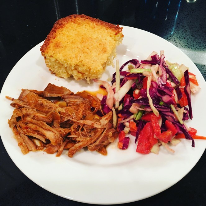 By 8pm I was so ready for dinner. We shredded the pork and put it back in the crock pot, stirring it all together with the sauce. Ideally, I would have liked the pork to cook for another hour to really absorb the sauce and flavor – but I couldn’t wait that long. It was still an amazing dinner!! It paired perfectly with the slaw and the cornbread we had!
