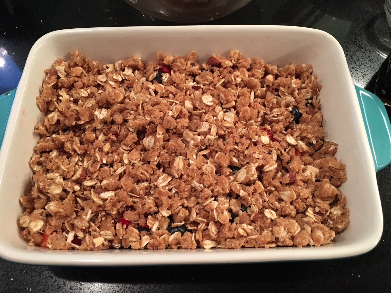 After the topping came together I poured the berries into the small baking dish I was using:
